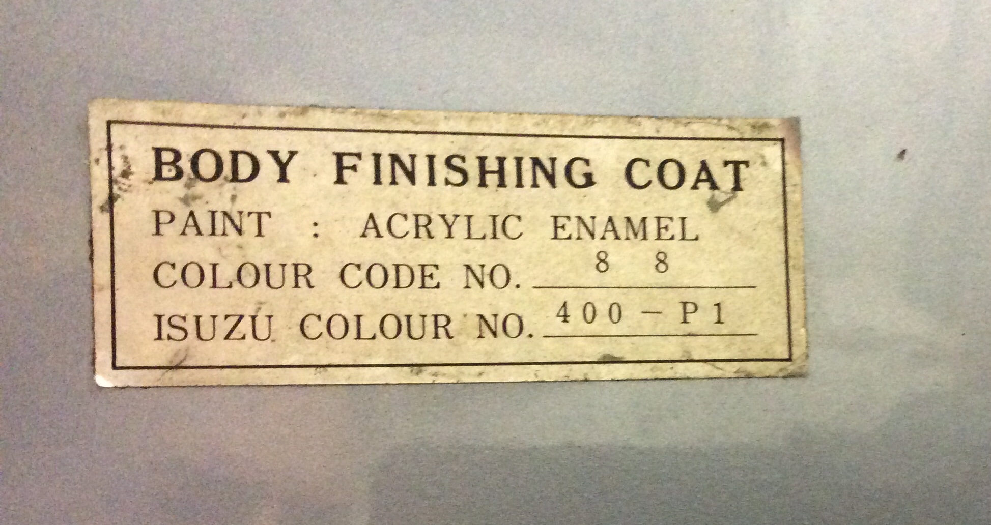 Hi Peter, Excellent to see you working on such a rare car! Let me know if you need any specific photos of my PR90 Inside or out to help with its reassembly. I have attached a photo of the original sticker under my PR90 bonnet ( that I carefully removed before its restoration in 1991 then reattached) showing paint code 0088 Silver Grey (as per the brochure of the 1967 Bellett Gt.. but same colours as PR90.....Isuzu White or Silver Grey) It was repainted in Acrylic Enamel back in 1991 very close to the factory colour. I beleive the actual formulations for the paint codes were hard to find even back in the 90’s s, so a lot of matching by an experienced painter was done for our belletts and other Isuzu’s. In 2011 after some areas of that paint job were failing and some bubbles appeared I bit the bullet and stripped the car of external bits then took it to my local panel shop who talked me into refinishing it in water based 2 pack. Not the best result for 2 reasons 1. The old repairs on a few panels, although isloated with the relevant undercoat still allowed moisture vapor to push through to create some bubbling in the flexible 2 pack layers. 2. The colour match of this 2 pack to the factory silver grey is pretty good in low light or the shade but under bright sunlight it does appear to be more silver. I am still very happy with the even gloss finish it has after 7 years but I would definitely recommend to repaint yours in a solvent based paint .....steer clear of water based 2 pack! I hope this helps.