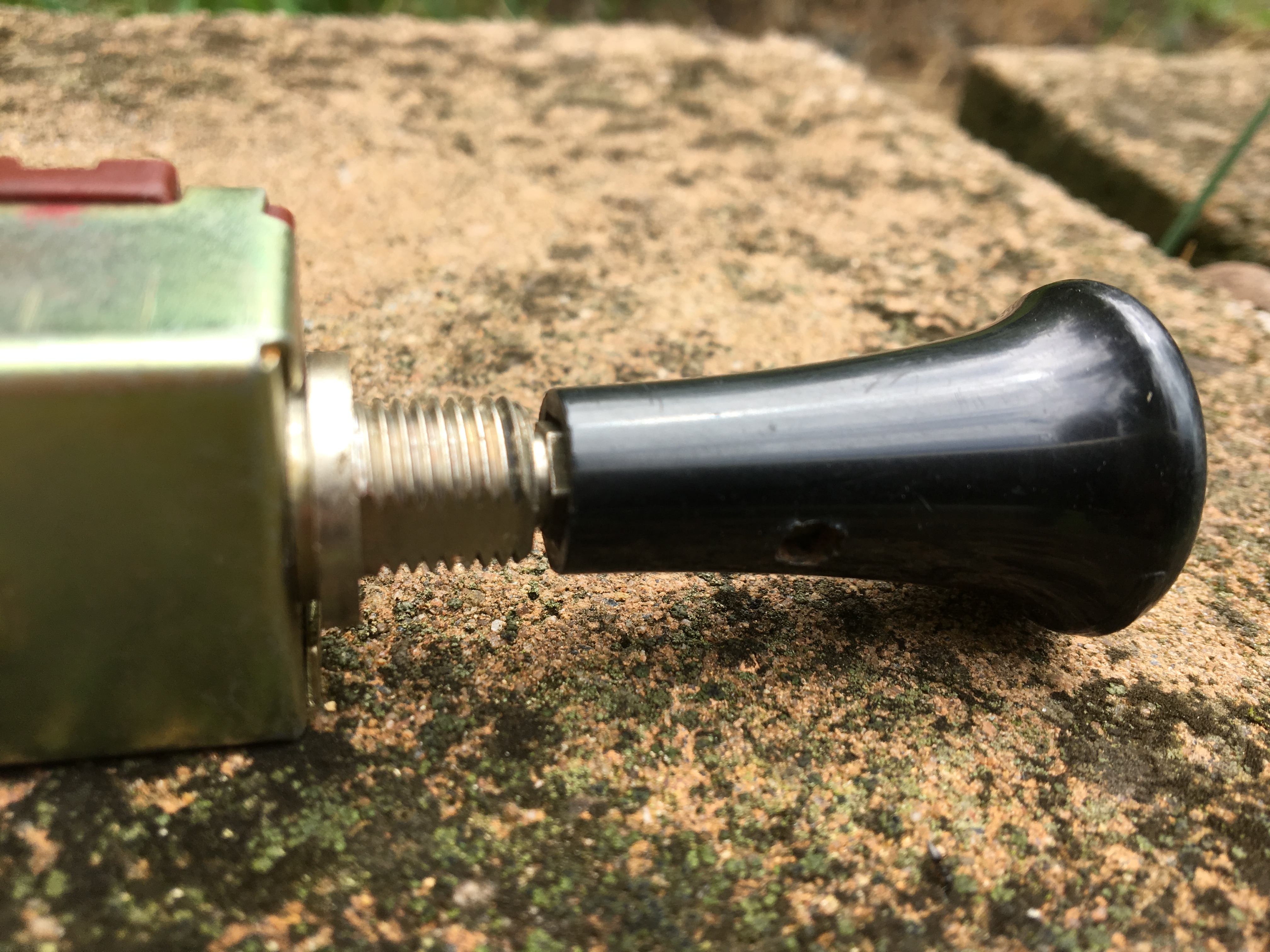 Every time I visit the garage, I seem to find another problem or some. Today I discovered, that one connector on the light switch is broken. That caused the heating. How to remove the light switch plastic knob? There seems to be some kind of a brad in the knob, but I couldn't figure out, how to remove it.