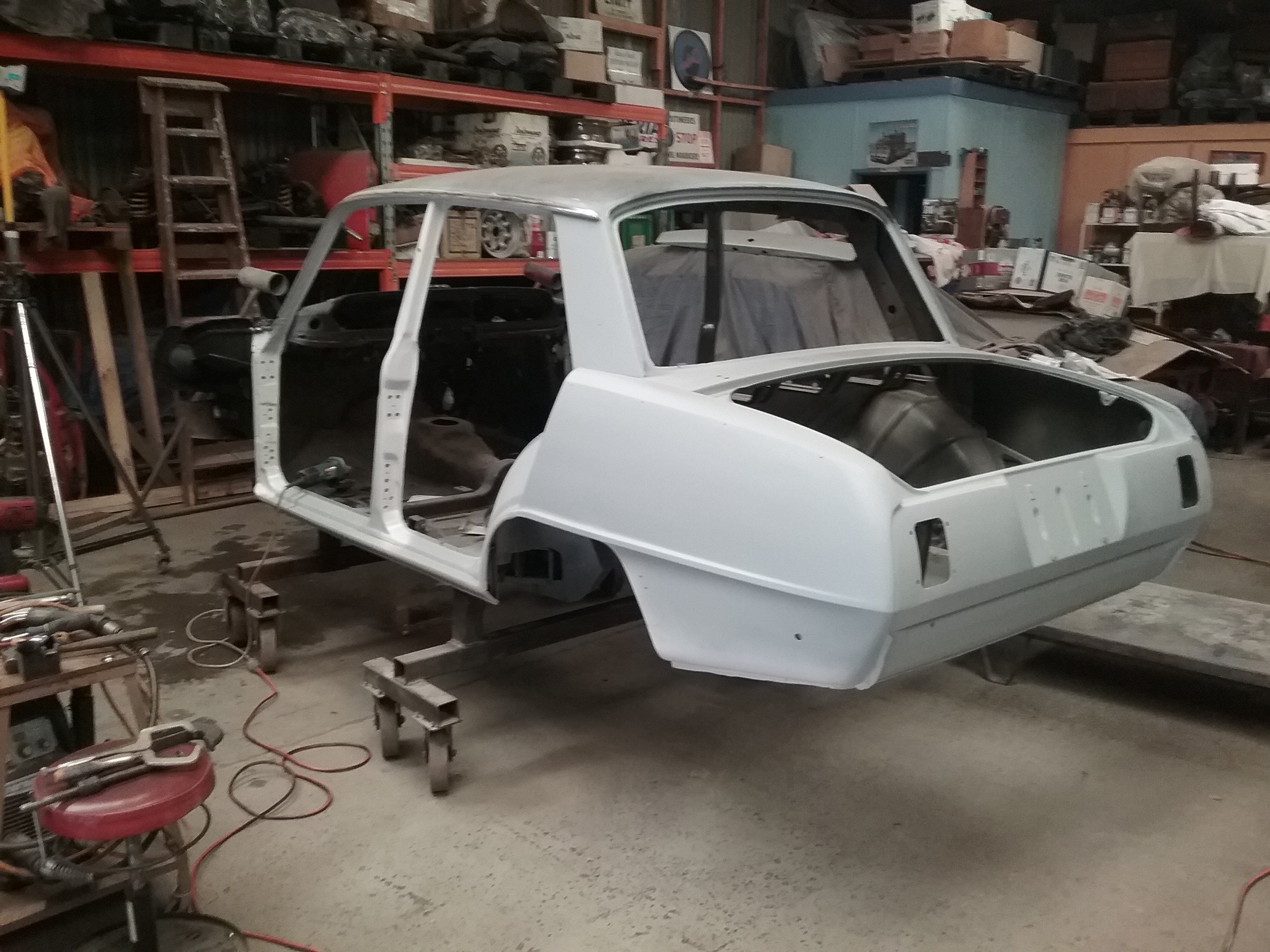 The car had degraded somewhat since then and was a dark grey shell in my workshop . Paying work stops me from playing with my cars - until we had the year we had to have . This became my COVID project . Put on rotisserie , rust repairs, prime and paint underneath , interior, boot engine bay then it got too cold . Installed drivetrain , wiring , dash , seats , rollcage , then it warmed up . Prepare & paint exterior .