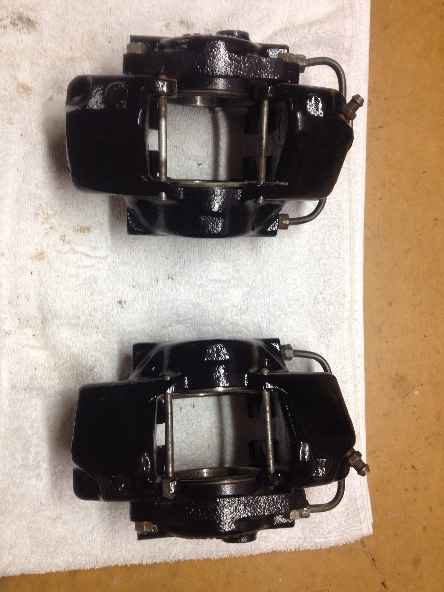 I am trying to find out what calipers are on my GT. I saw where Davo mentioned that he had fitted a front brake conversion to his GT but I am not sure if these are the conversion ones or genuine GT. The ones that I have do not have any pads and my parts book does not show pictures of Disk brakes. The car came with a photo album that shows these calipers were rebuilt but I will get them checked out as they may have rusted up since the rebuild. I think I may have found some NOS pads for a GT but I have no idea what they look like or dimensions. I would appreciate it if somebody could identify these calipers from the pictures provided and also send me a picture of some front pads. Hopefully they are GT and the pads I have found will fit. Many thanks