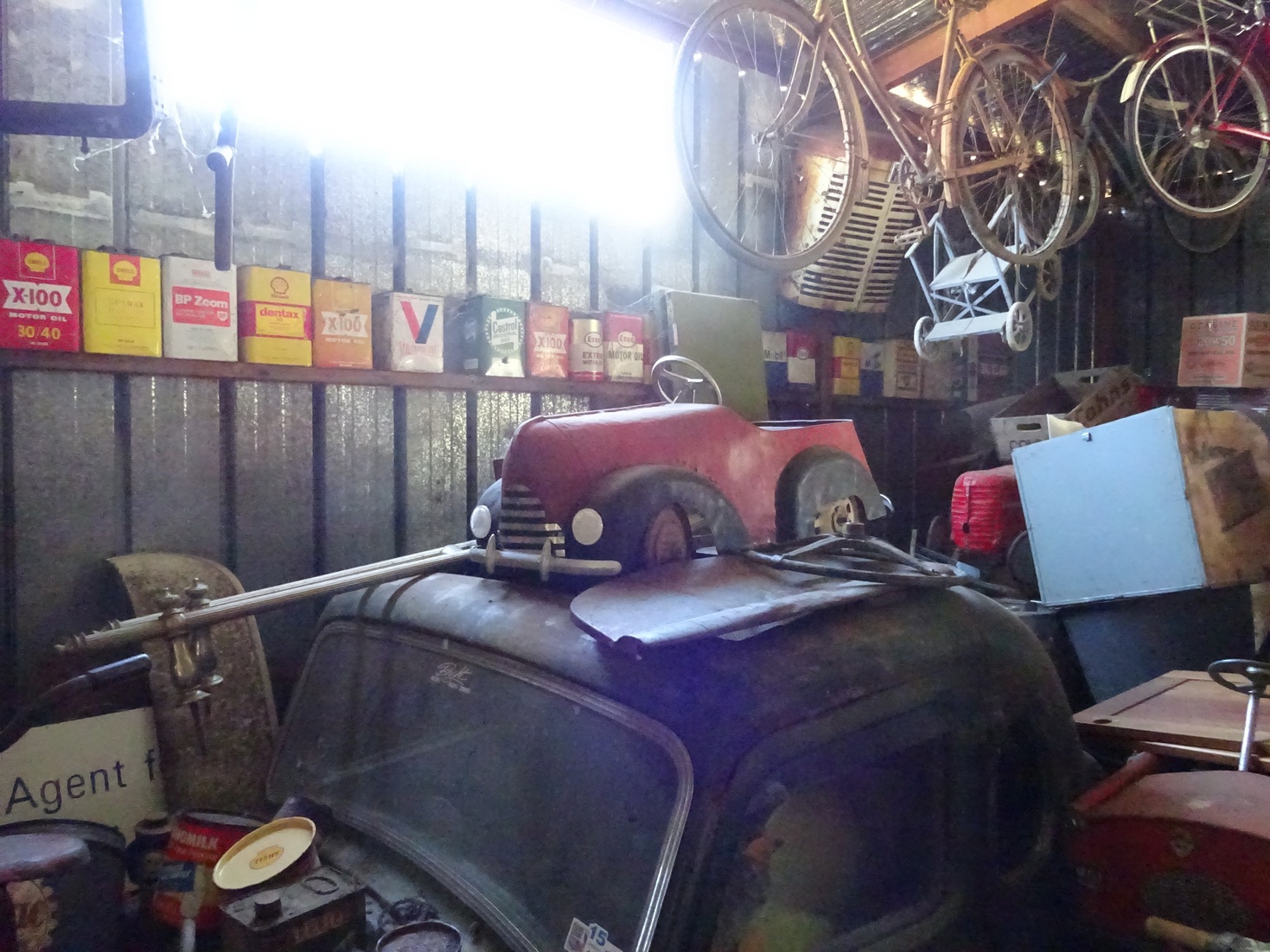 Then we started in the first shed...... you could barely move for the amount of gear he had in there, cars, bikes, vintage, hotrod, ratrods, toys, tins, signs, bowsers, bottles, legless mannequins...... It wasn't easy taking photos in there but here are a few that worked out ok Attachment: