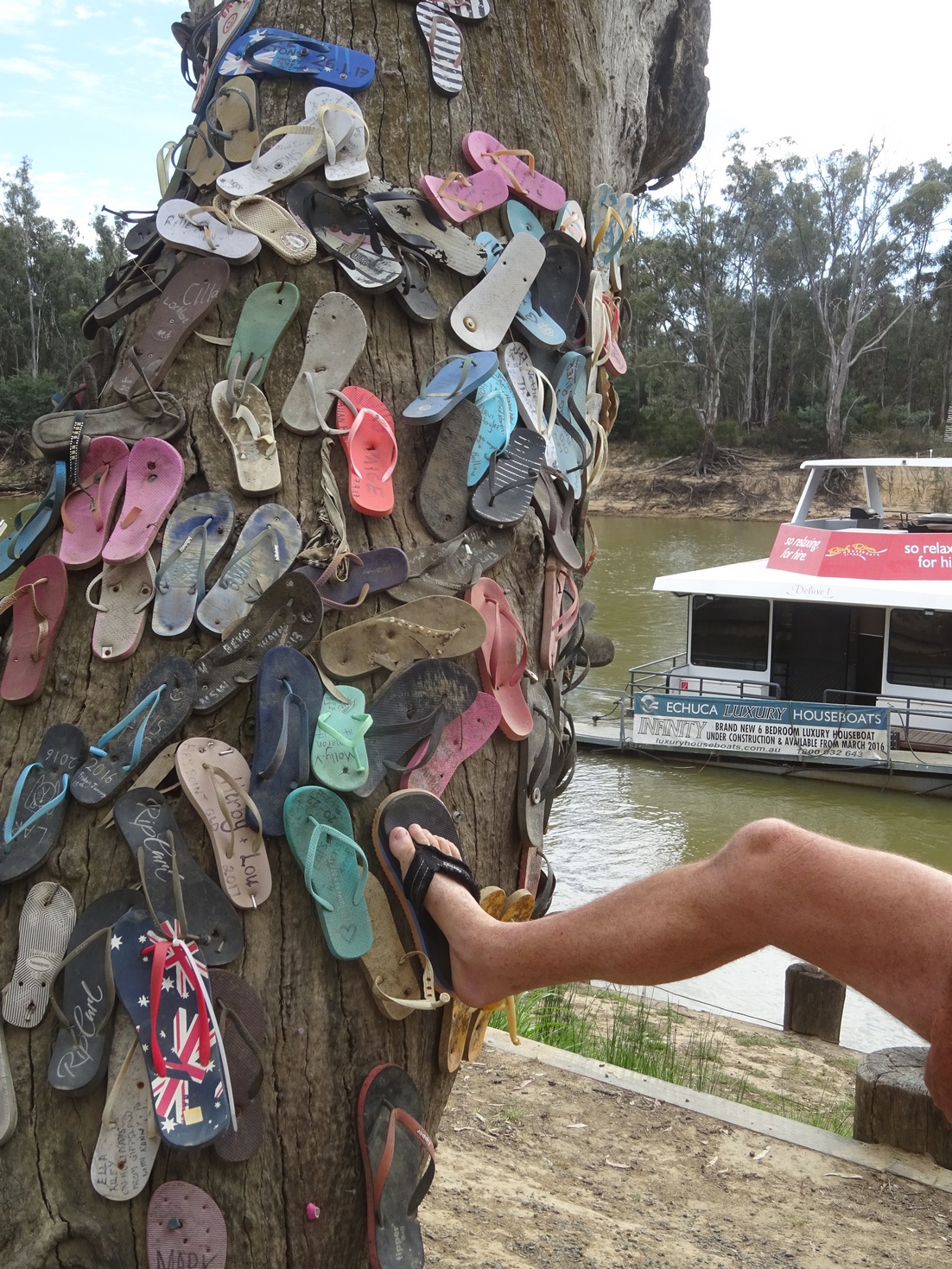 A must visit in Echuca is the "Thong Trees" down by the paddle steamer docks..... and who better to have in your company at such a sacred place than the one and only Mr Thong himself - GT Orphange, thong aficionado extraordinaire (he even tried a couple on for fit) Attachment: