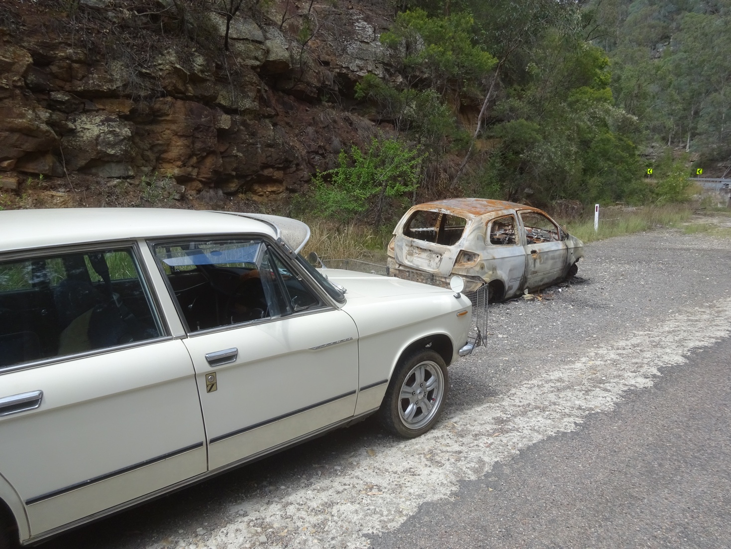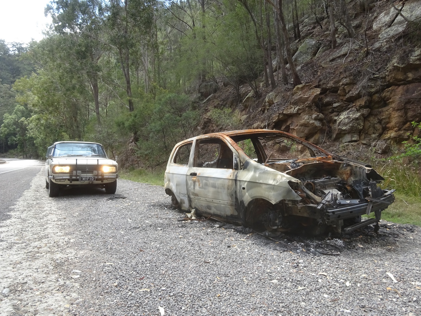 Yesterday morning I left Stroud bright eyed and bushy tailed after a great night sleep. I back tracked a couple of km's then headed toward Singleton via Dungog. It was a fantastic drive though the countryside, meandering through the hills on sections of road that seemed to be stitched together with myriads of pothole patches. Surprisingly enough the road was still pretty smooth to drive on. I stopped briefly in Dungog for breaky then headed for the Putty Road over the Blue Mountains. About 1/4 of the way into the Putty Road I spotted an abandoned car that I think might have over headed..... but I'm no mechanic so that's just a stab in the dark. I'd have kicked the tyres while I was there too but it had none  Attachment: