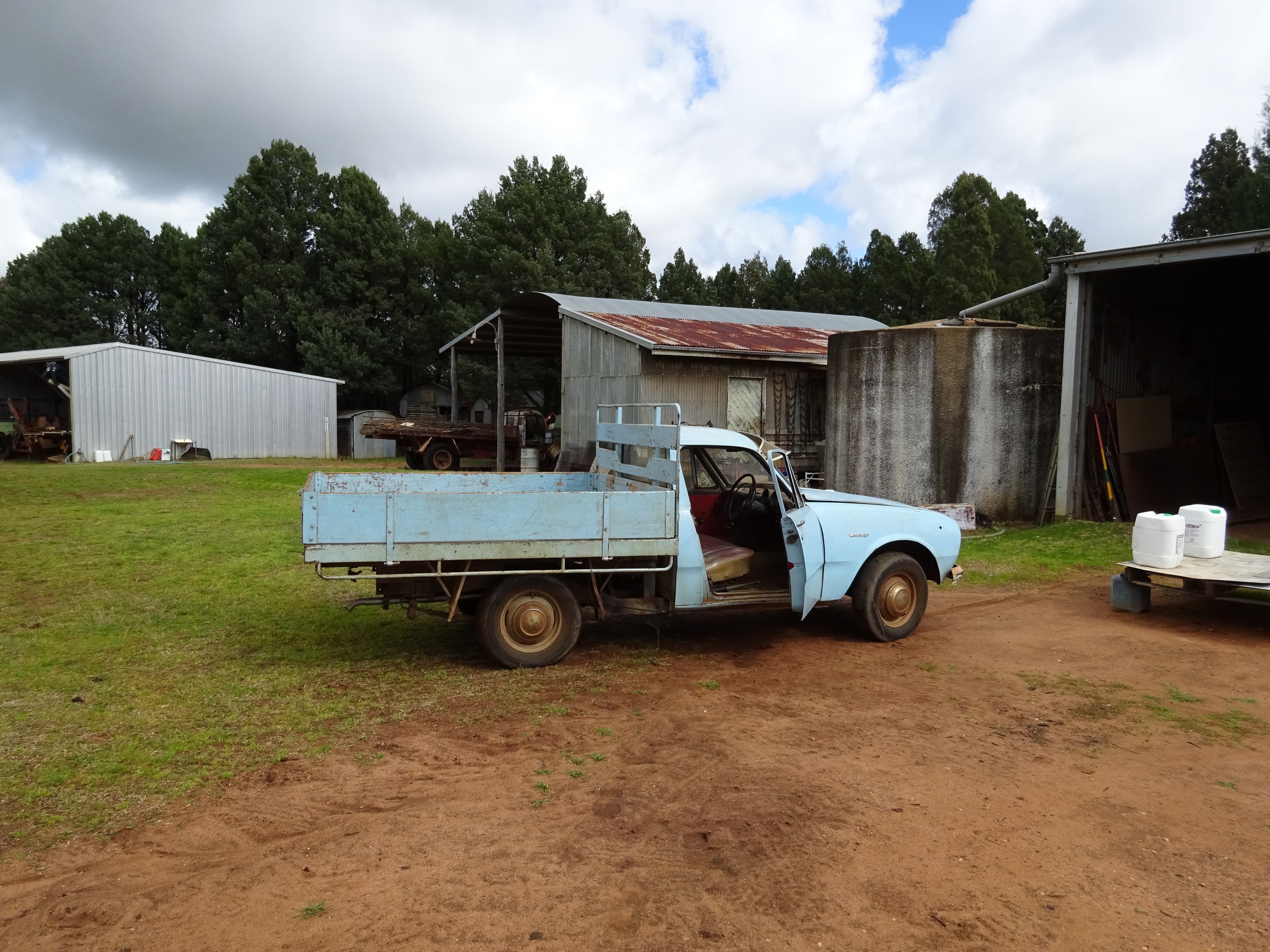 Farmer wrote: :shock: Wow! And look at the seat! So original, what a great find mate. Just need a couple of guard blinkers and rego time. Mate he is so nice, can't wait to see him at Mudgee. Possibly? Enjoy the little tidy up mate, you deserve a relatively easy one. He is in good hands.  Matt. He has his guard blinkers, tail lights and front bashpan panel inside the cab plus a few other non essencials The only things he is missing is a piece of trim on centre of grill, 1 hubcap (has 1 painted and 2 "use to be" chrome ones) and the top metal trim on the drivers door (I have plenty of those) + one badge is broken in half. Other wise it's complete I haven't even cleaned it yet as I want it's first showing to be as close to farm fresh as possible. Mudgee is definitely on the cards for this little ute. I put on new leads last week - new upper n lower ball joints and inner n outer tie rod ends get here Friday then I'll lift engine to replace sump gasket and throwout bearing and head gasket too. I won't be pulling the old tyres of the orig rims though. I bought a set of rims last week (similar to Shrek's) that will get the driving duties instead