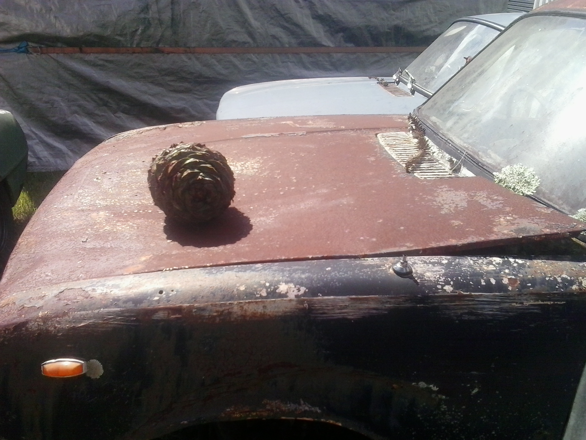 This is what happens to a Wasp bonnet when an 11kg Bunya Pine nut falls from the top of a 15m tree, ricochets off a steel post and clobbers it with intent to inflict harm......... The photo doesn't really show how bad the dent is but it has sunk the bonnet below the rocker cover and lifted the passenger windscreen corner 3 inches above the guard But she'll be right, I'll just flip it over and stand on it I'm just thankful it didn't hit Donkey instead. He's parked 1m in front of the Wasp atm Attachment: