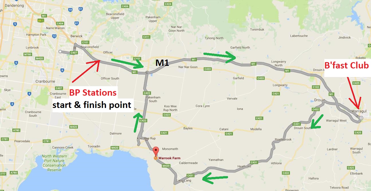 We might come back the slightly longer way, via Ripplebrook, Lang Lang etc & back to the BP on the opposite side of the freeway in-bound, from start point.
